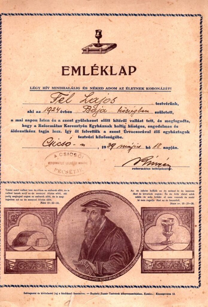 Emléklap kiállítódott 1939. május 18-án, Fél Lajos részére.
