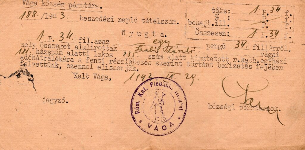 … jelen sorokkal kijelentjük, hogy Vága leányegyházat 1943. január 1-én kezdődő hatállyal plébánia rangjára emeltük. Ezzel a vágai katolikus hívek felett a plébánosi jogokat a jövőben minden tekintetben függetlenül az új, azaz a vágai plébánia vezetője gyakorolja. A vágai leányegyház helyi járandóságai ezentúl a vágai plébániát illetik…”