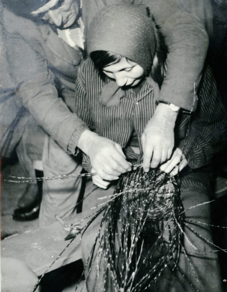 A kosárfonást Török Imre bácsi tanítja a diáklánynak.