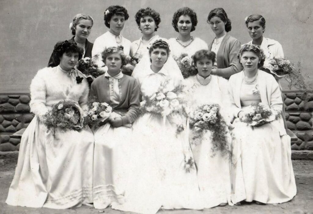 Koszorúslányok állnak, balról jobbra: Szlízs Erzsébet (Rechtné), Forró Anna, Puczoló Lídia (Jalsovszkyné), Kiácz Piroska (Gyeváthné), Gyeváth Rozália (Takácsné), Forró Ilona (Sztoklaszné).