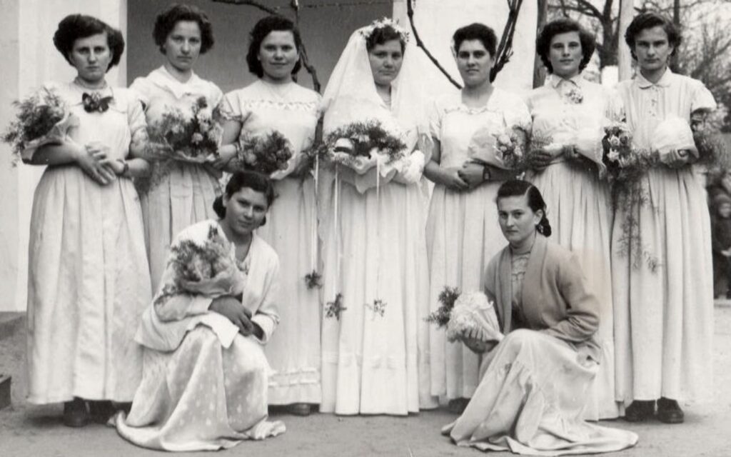 Koszorúslányok állnak, balról jobbra: Major Mária (Kotrbáné), Forró Piroska (Jalsovszkyné), Klaszta Terézia, Majerník Ágnes (Forróné) menyasszony, Zsigó Irén (Bukovszkyné), Forró Margit ( Zsigóné), Forró Mária (Forróné).