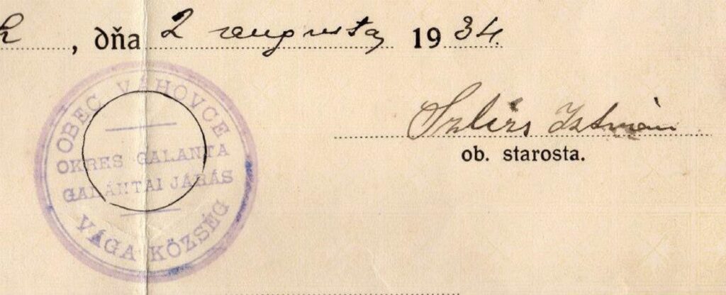 Községünk kétnyelvű körpecsétje és az akkori bíró (ma polgármester), Szlízs István aláírása.