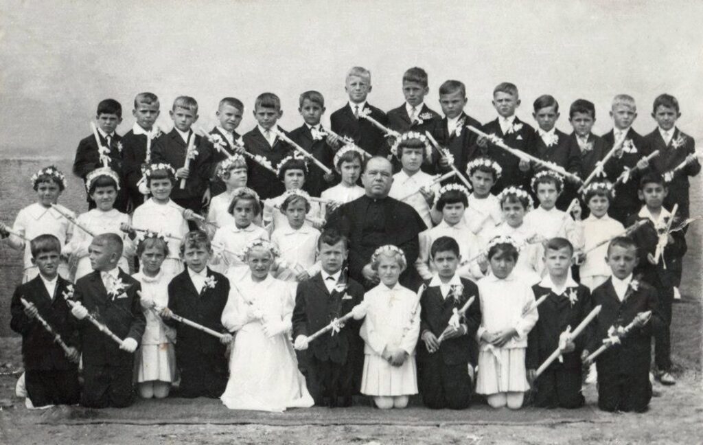Középső sor, balról jobbra: Dudás Emília, Jalsovszky Mária, Kozmér Magda, Jalsovszky Erzsébet, Zelinka Magda, Németh Magda, Takács Erika, Kamenár Eszter, Kubica Anikó, Éliás Edit, Kudri Rudolf. A plébános jobbján: Horváth Eleonóra, Molnár Magda, Lakatos Imre (plébános), Andriszák Etela (balján), Novoszád Júlia.