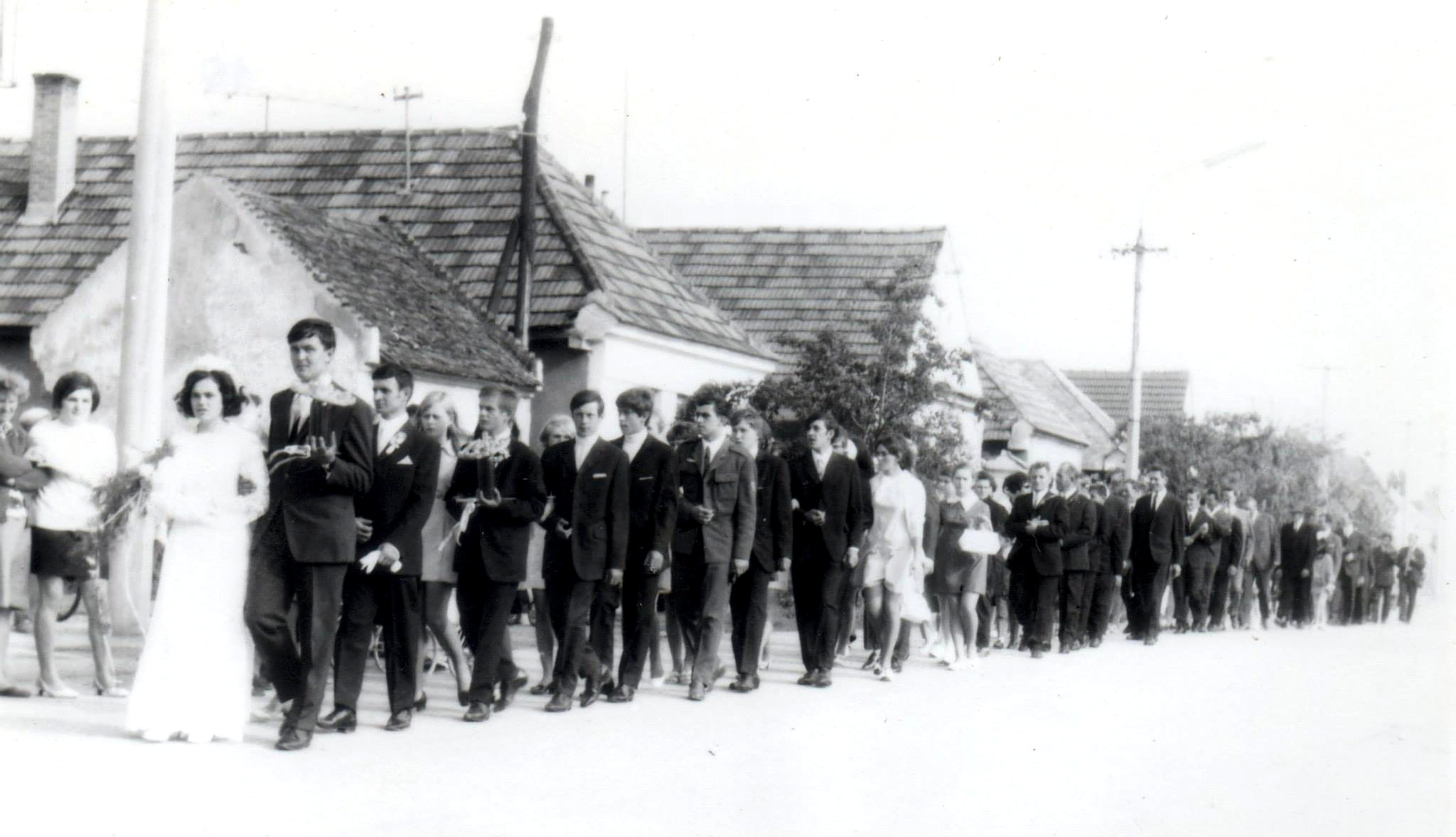 A templomba tartó lakodalmi menet elején: Puskás Magdolna (menyasszony) és Mészáros Tibor (vőfély), majd Marafkó Benedek (vőlegény) és a meghívottak.