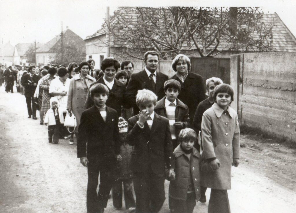 Kultúrházból induló lakodalmi menet, templomba vagy a Helyi Nemzeti Bizottság (mai Községi Hivatal) eskető termébe tartva…