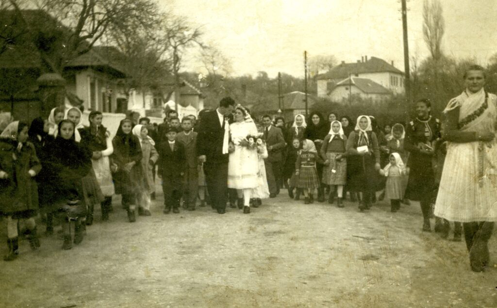 A lakodalmi menet végigvonult az utcán, a templomból a „lagzis udvarig”. Itt a főúton látjuk a menetet, közvetlenül a főtér előtt. A képen jól látható a nép- és polgári viselet keveredése.