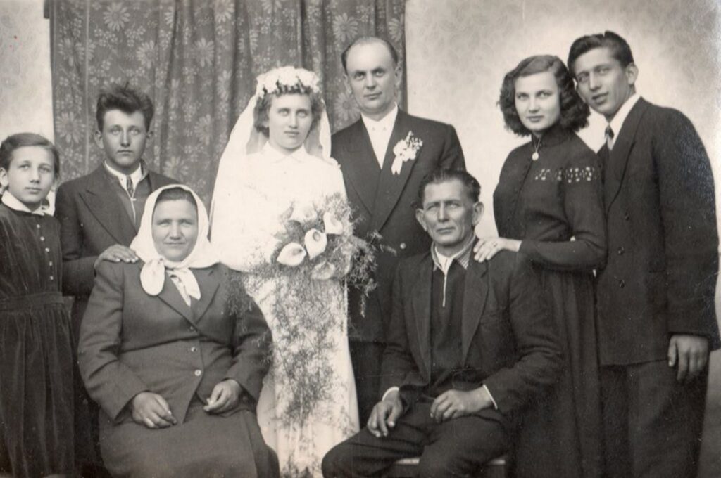 Balról jobbra: Szabó Margit (Zsigóné), Szabó Géza, Szabó Rozália (született Takács), Szabó Mária (menyasszony), Simkó Ferenc (vőlegény), Szabó István, Szabó Anna (Forróné), Szabó Ferenc.