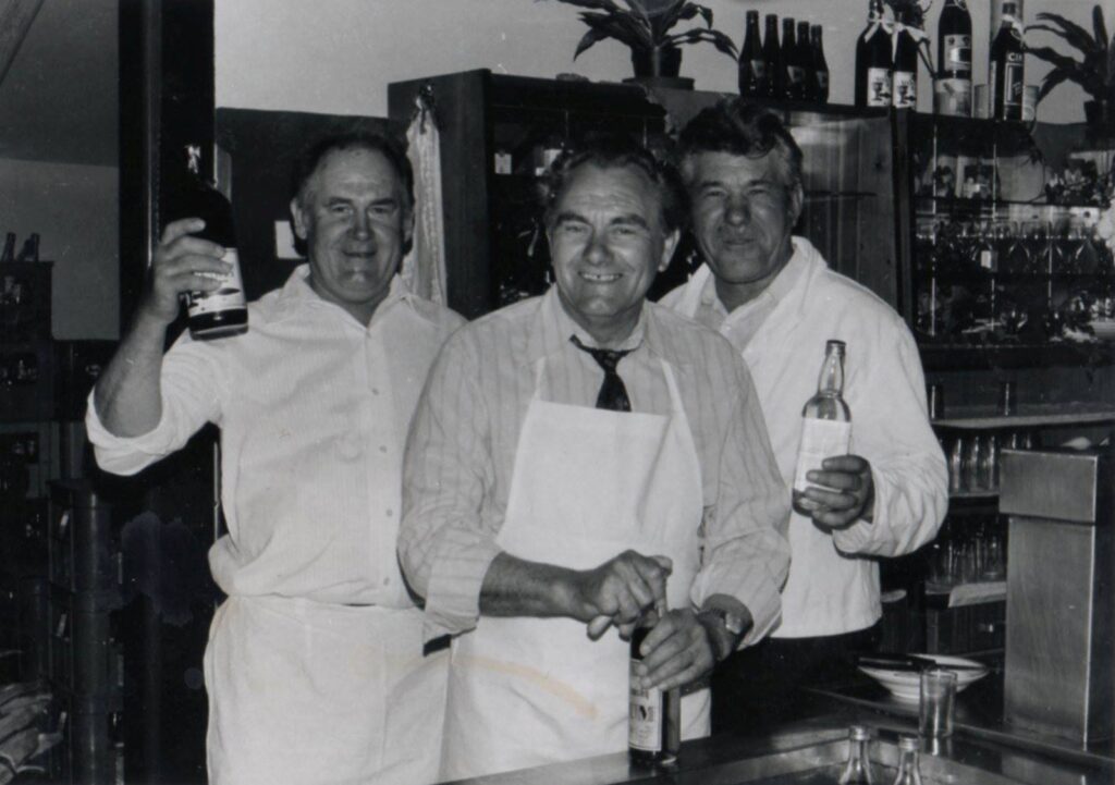 A régi ,,fenti kocsmában”, valakinek a lagziján: Bakó Ernő (balról), Jalsovszky Ernő, Zsigó József.