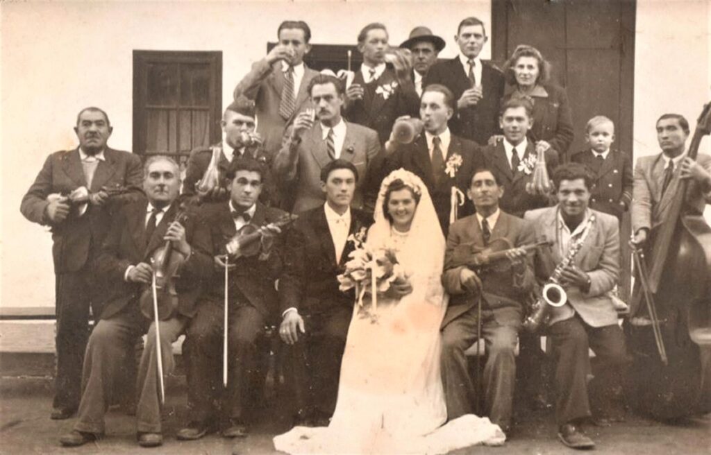 Középső sorban állnak, balról jobbra: ?, Forró István, Smíkal (Olomouc), Kamenár (vőfély), Jakubecz Árpád, ?, Patkoló Gyula.
