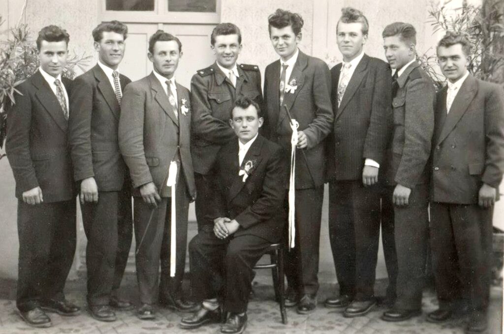 Balról jobbra: Hulák Ernő, Zsigó József, Zsigó László (vőfély), Gyeváth Albert, Adamkó Ferenc (vőfély), Takács Ernő, Szabó Ferenc, Vígh Gyula.