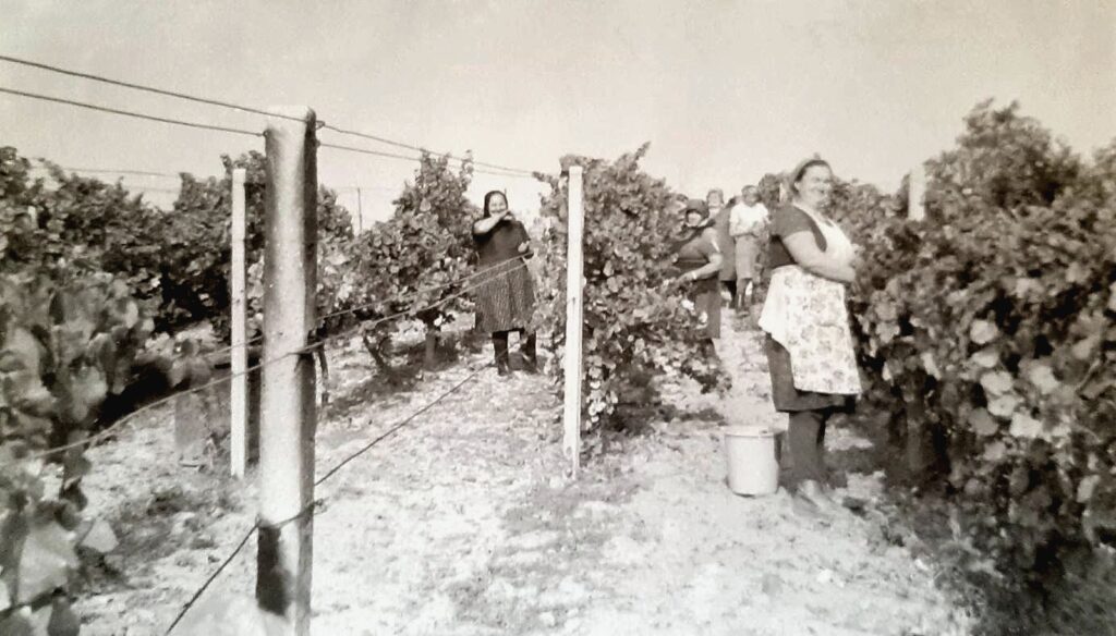 Tóth Sándorné Varga Erzsébet a kép előterében, a 80-as években a szövetkezeti szüretkor.
