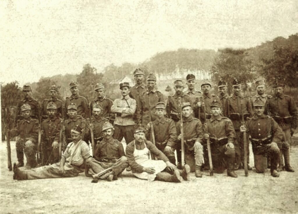 Édes Vince, puskatusra támaszkodva az osztagával az I. világháború idején.