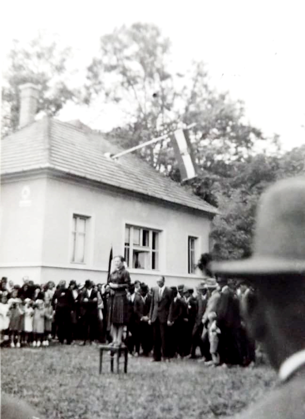 Nagybalog kb. 1944. A fotón az egykori jegyzői lak látható, ami később községi hivatal, majd orovosi rendelő lett. A felvételen valamilyen ünnepség van megörökítve. Érdekessége a képnek, hogy az épületre a magyar zászló van kitűzve.