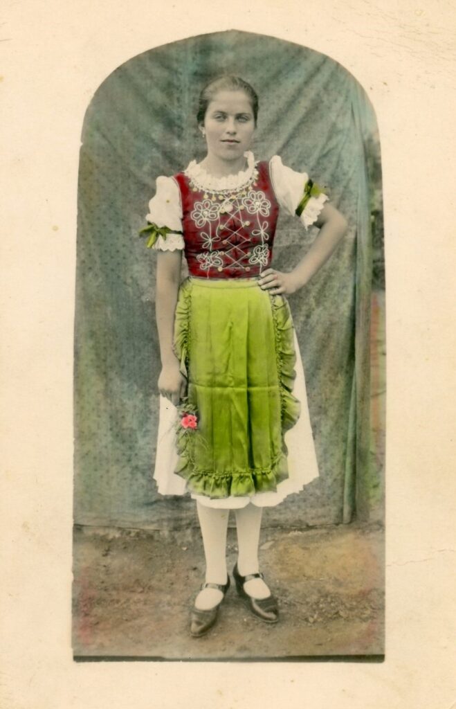 Buránszki Teréz 1939-ben, magyaros viseletben. Terézék négyen voltak testvérek: Anna, Teréz, Irén és Margit. Édesapjuk a falu cipésze volt.