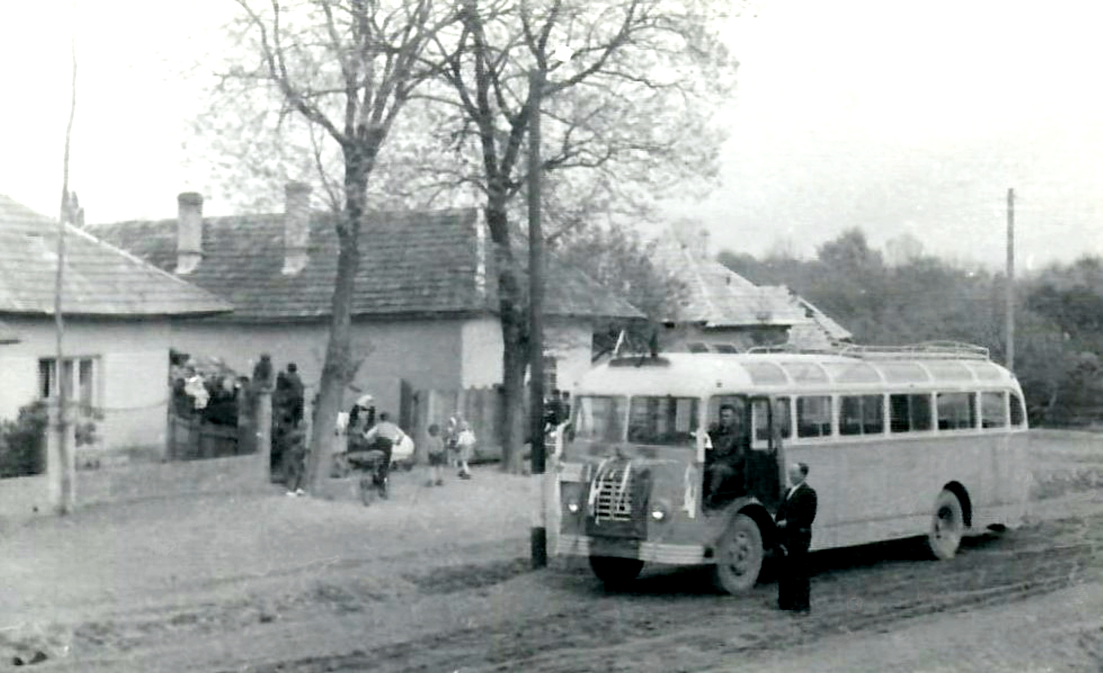 A képen a helyi lakosok a Május 1 felvonulásra készülődnek. Az autóbusz teljes díszben.