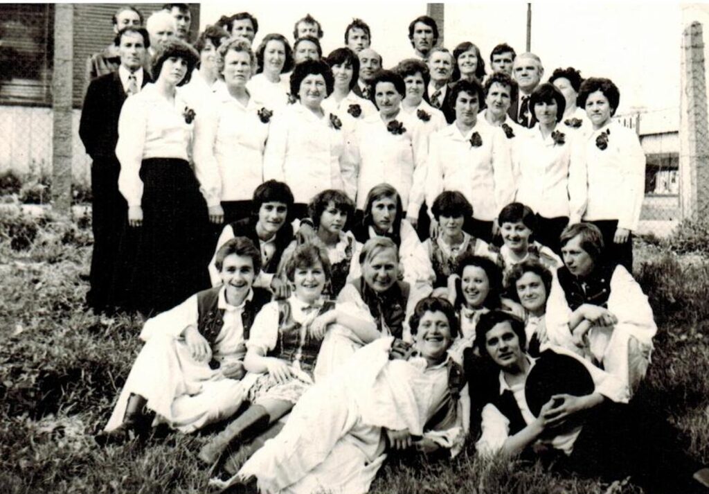 A sikeres bemutatkozás után a táncosok, énekesek, énekkar és szavalók egész estét betöltő műsorokra vállalkoztak Mátyusföldi Nyíló Rózsa népi Együttes néven. Elfogadták a meghívásokat a közeli és távolabbi falvakba. 1980 tavaszán Pozsonypüspökibe voltak hivatalosak. Amikor megérkeztek, üres kultúrházat találtak. Rövid utánajárás, ill. a kihelyezett plakát láttán rájöttek a baj okára: előző nap várták őket. A községháza vezetője kihirdette, hogy megjöttek a fellépők, s estére összejöttek az érdeklődők ismét. A műsor nagyon jól sikerült a tévedés ellenére is. A képen az énekkar, a tánckar és a zenekar látható.