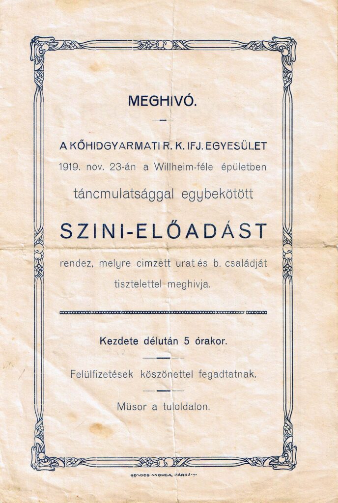 Az eddig fellelhető adatok alapján 1919. november 23-át mutatott a kalendárium, mikor először gördült fel a függöny a kőhidgyarmati színpadon. A r.k. ifjúsági egyesület Csepreghy Ferenc: A piros bugyelláris c. népszínművét vitte színre a Willheim-féle épületben.