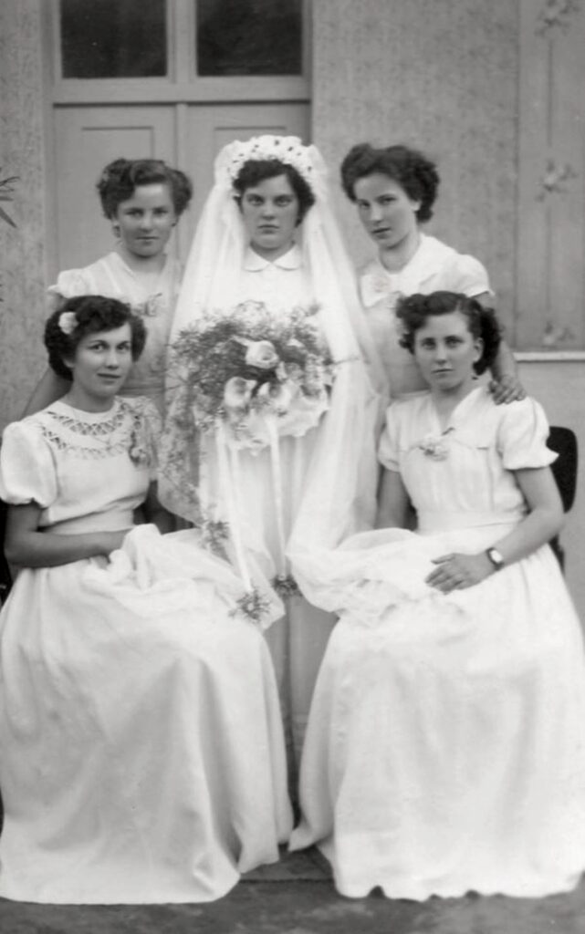 Állnak balról jobbra: Forró Ágnes (Zsigóné), Jalsovszky Mária (Dudásné, menyasszony), Forró Erzsébet Piroska (Jalsovszkyné).
