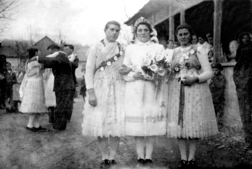 A menyasszony látható két nyoszolyólánnyal. A menyasszony már modernebb viseletben van, a nyoszolyólányok még a hagyományos pruszlikot viselik. A háttérben mulató fiatalokat látunk.