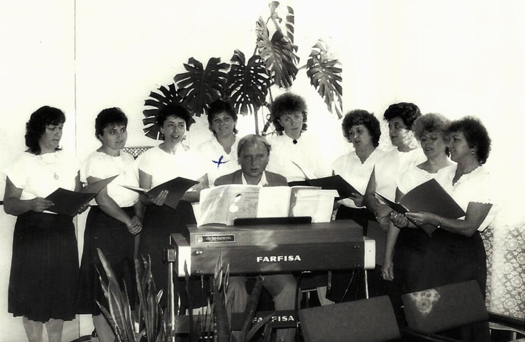 Menyecskekórus – 1987 – Gál Jenőné, Lukács Lajosné, Bazsó Kálmánné (vezető), Gál Ivánné, Halász Kálmánné, Lukács Tiborné, Szabó Lászlóné, Kiss Ernőné, Takács Lajosné, kísér: Gál Iván