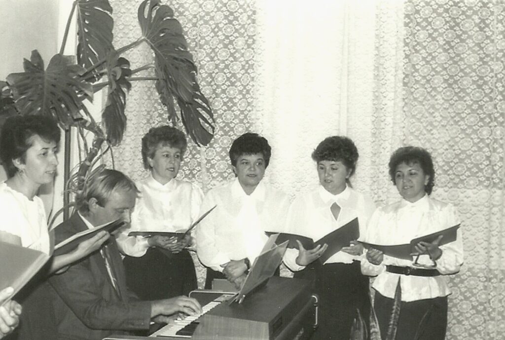 Menyecskekórus – 1988 – Bazsó Kálmánné (vezető), Lukács Jánosné, Szabó Lászlóné, Lukács Tiborné, Takács Lajosné, az orgonánál: Gál Iván