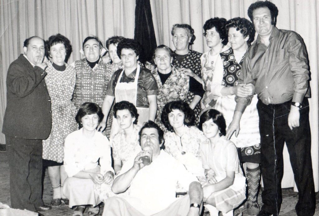 Kultúrház színpadán a szakácsnők és a felszolgálók, valamelyik lakodalomban.