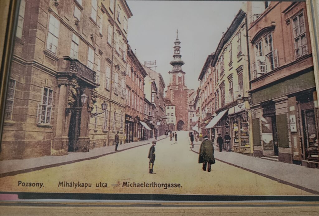 A kép a Mihálykapu ucát ábrázolja, Pozsony óvárosában. Az utca végén, a kép középpontjában található Pozsony egyik ikonikus pontja, a Mihálykapu