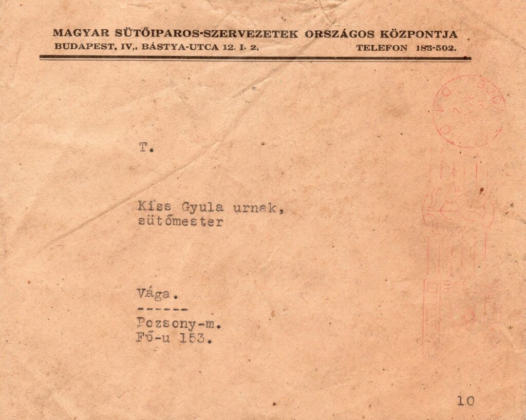 A sütőmester részére küldött levél borítékja, amely sütőmestert, Vágán, Pék Gyulának hívott mindenki.