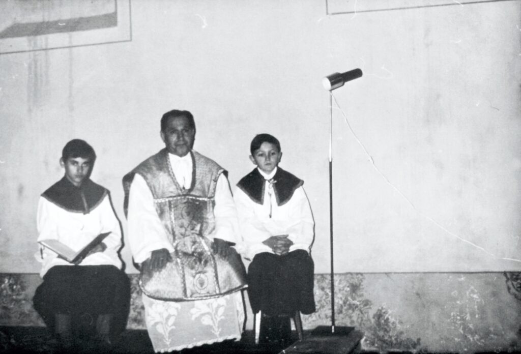 A ministránsok a pap mellett kisebb szolgálatokat végeznek a mise és egyéb szertartások során. Rendszerint fiú gyermekek és fiatalok, akik ministráns ruhában vannak. A képen Horony András plébános valamint két ministránsa, Bódis István és Hordósy Tibor vannak megörökítve.