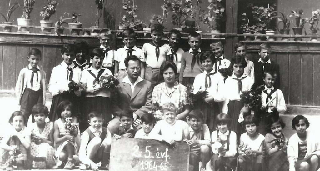 Nagybalog, 2. és 5. évfolyam tanévzárója 1964-65-ben a régi iskolánál. Igazgató Gál Gyula.