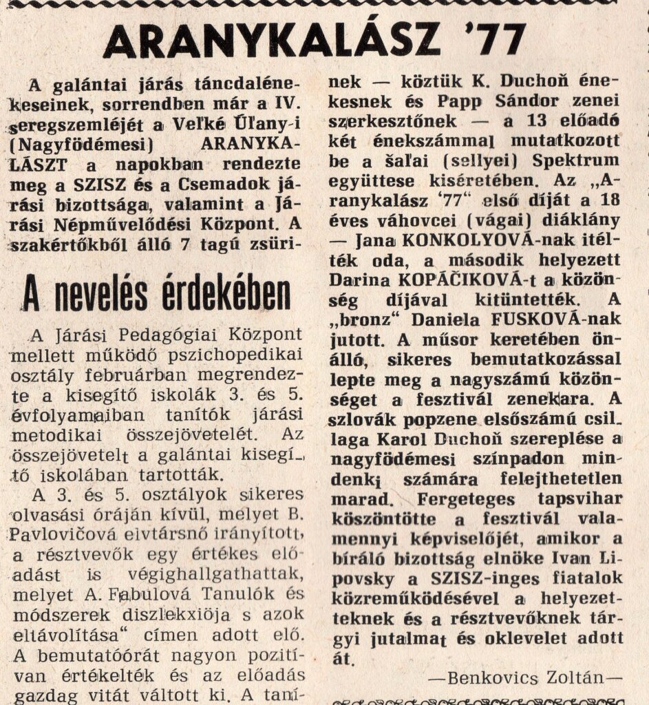 A Galántai járás táncdalénekeseinek, sorrendben a VI. seregszemléjét, a Nagyfödémesi Aranykalász első díját, a 18 éves vágai diáklánynak, Konkoly Janának itélték oda.