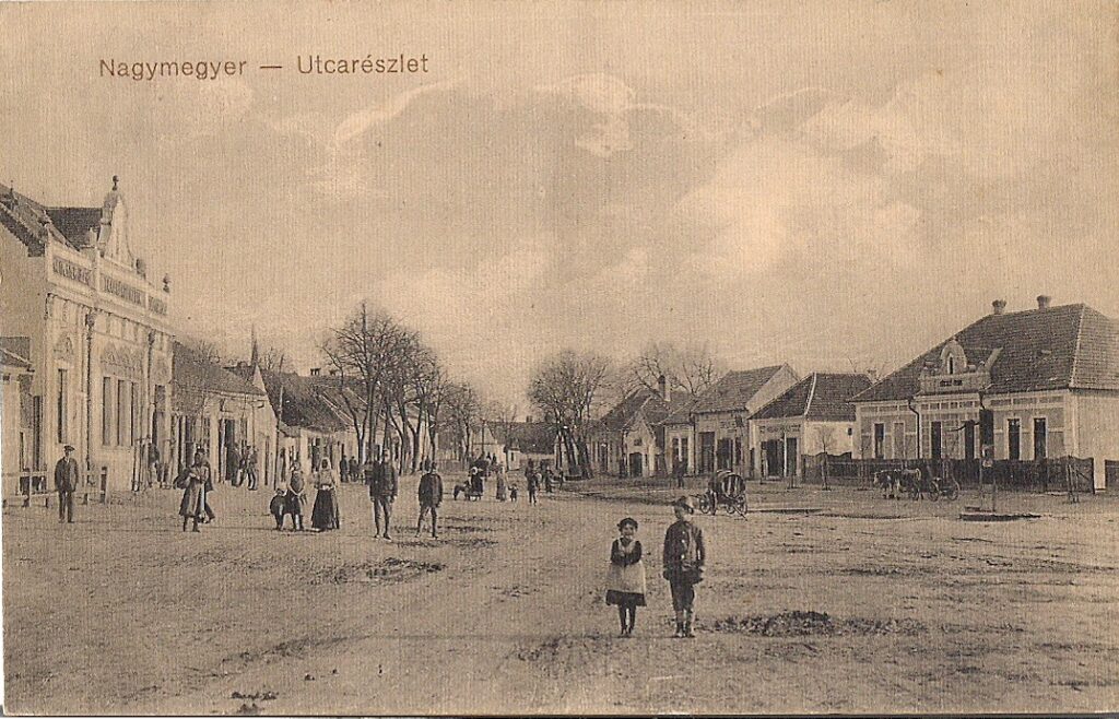 Nagymegyernek a háború kitörése után 3586 lakosa volt. A népesség növekedése befolyásolta új közintézmények kialakítását. 1900-1914 között számos új épületet adtak át a városban. Ezek közé tartozott: új községi óvoda, (a kép jobboldalán) Nagymegyer és Vidéke Takarékpénztár épülete (a kép balodalán) a város főterén. A Csallóközi Hírlap szerkesztői többször foglalkoznak a járdák hiányával a városban. Szinte járhatatlanok A járda-probléma megoldása kitolódott az 1. világháború kitörése utáni időszakra. A nagymegyeri fogolytábor lakói kezdték el a város járdáinak építését. A járdák hiánya a főtéren csak később oldódott meg.