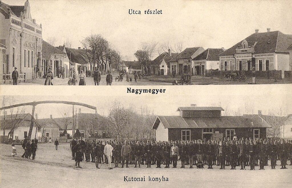 Az 1. világháború kitörése után Nagymegyeren is általános lelkesedés uralkodott. Az emberek többsége elfogadta, hogy ez nem más, mint a magyar nemzet harca a szerbekkel, akiket meg kell büntetni. Bár az első megszorító intézkedések azonnal érvénybe léptek (katonaköteles férfiak kiutazásának korlátozása), a város lakosait mindez kevésbé érintette. A várost megszállta a katonaság, itt történt a behívott katonák eskütétele is. Az 1914-es képeslap felső részében a város főtere az alsó részén pedig a városban tartózkodó katonai egység látható.
