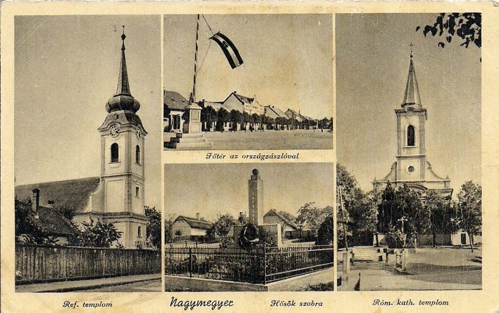 Az 1938. november 2-i 1. bécsi döntés értelmében Csallóközt – és ezáltal Nagymegyert is – ismét Magyarországhoz csatolják. 1939-ben Nagymegyernek 4644 lakója volt. Az 1939-es év első felében a visszacsatolt területeken a települések főterén ünnepélyes keretek között felhúzták az országzászlót. Nagymegyeren ez az országzászló ünnepélyes felavatására 1939. június 4-én került sor. Az alatta lévő kép a Hősök terén 1938 novemberében, az 1. világháború hősi halottainak emlékére felavatott emlékmű. A kép két szélén a város két temploma, baloldalon a református templom (1795-ben épült), jobboldalon a katolikus templom (épült 1900-ban) látható.