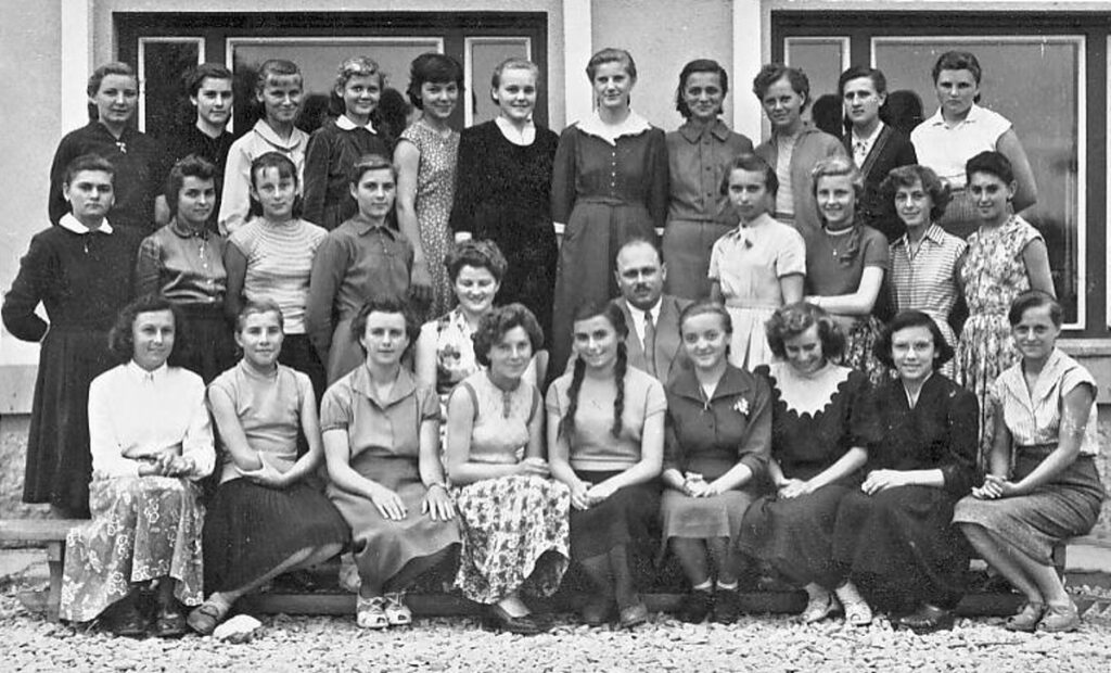 1957 szeptemberében megnyílt a Nagymegyeri Tizenegyéves Középiskola. Az iskola két osztállyal indult. Az első 63 tanuló a nagymegyeri, illetve a környékbeli falvak iskoláinak tanulóiból került ki. Az 1960-69-es években az iskola 16 nappali tagozatos végzős osztályában 457 tanuló érettségizett, az esti tagozat 3 osztályában 34 tanuló. A képen a hatvanas évek elején, az iskola egyik osztálya látható, Jakab István igazgatóval és Tankó Mária osztályfőnökkel.