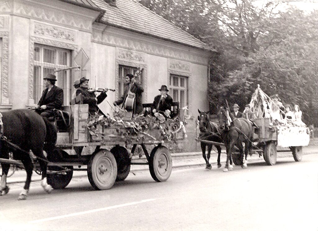 A hetvenes években a társadalmi szervezetek között aktív szerepet töltött be a Kiskertészek Szervezete. Az 1973-ban készült fotón a szüreti bálon való részvételre hívják a város lakóit a zenés felvonulással.