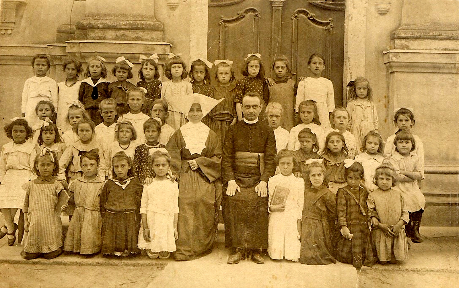 Az 1932/33-as iskolaév kezdetén, ugyan kismértékben, de tovább nőtt a beiratott gyermekek száma, és elérte a 199 főt. A szegény gyermekek támogatása ebben a tanévben is megvalósult. Ezt részben a Charitas segítette, aki a gyermekek téli ruháját biztosította. A Népjóléti Bizottság pedig 1933. január 16-tól, három hónapon keresztül, 60 gyermeknek 2 dl. tejet és 20 dkg kenyeret biztosított. A fotó a nagymegyeri Szent Miklós Római Katolikus templom előtt készült. A tanulók Marczy József esperes plébános és Pataky Mária Olga nővérrel láthatók.