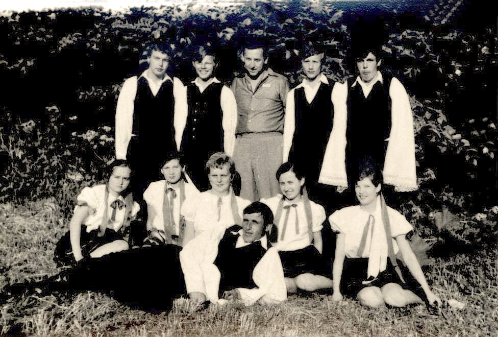 A nemesradnóti tánccsoport vezetője Szakall Géza iskolaigazgató volt. A fénykép a zselízi vendégszereplésük alkalmával készült. A tagok közül néhányan: Farkas Katalin, Pozor István, Dobos Géza, Hencz László.