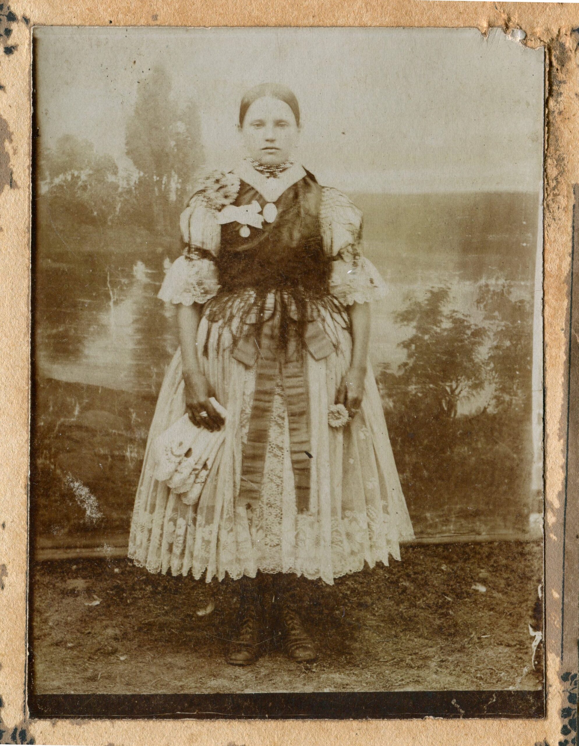 Jellegzetes, idegen elemektől szinte még mentes női vagy inkább lányviselet (ezt jelzi a fedetlen haj), hagyományos mellényben (ubbony), fodros ingben.