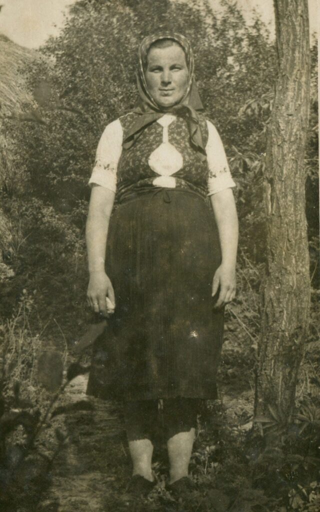 Újabb kori női viselet, figyelemre méltó a bal felső sarokban látható szalmazsuppal fedett, ún. „kicés” háztető.