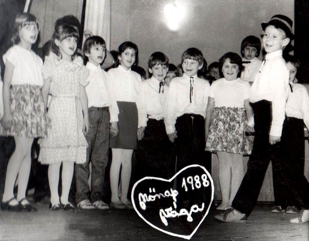Nőnapi rendezvényen, a községi kultúrház színpadán: Kiss Andrea (balról), Kozmér Klaudia, Rišňovský Patrik, Józsa Denisza, Foltán Zoltán, Unter Adrian, Farkas Natália, ?, Takács Tamás, Párkány Péter.