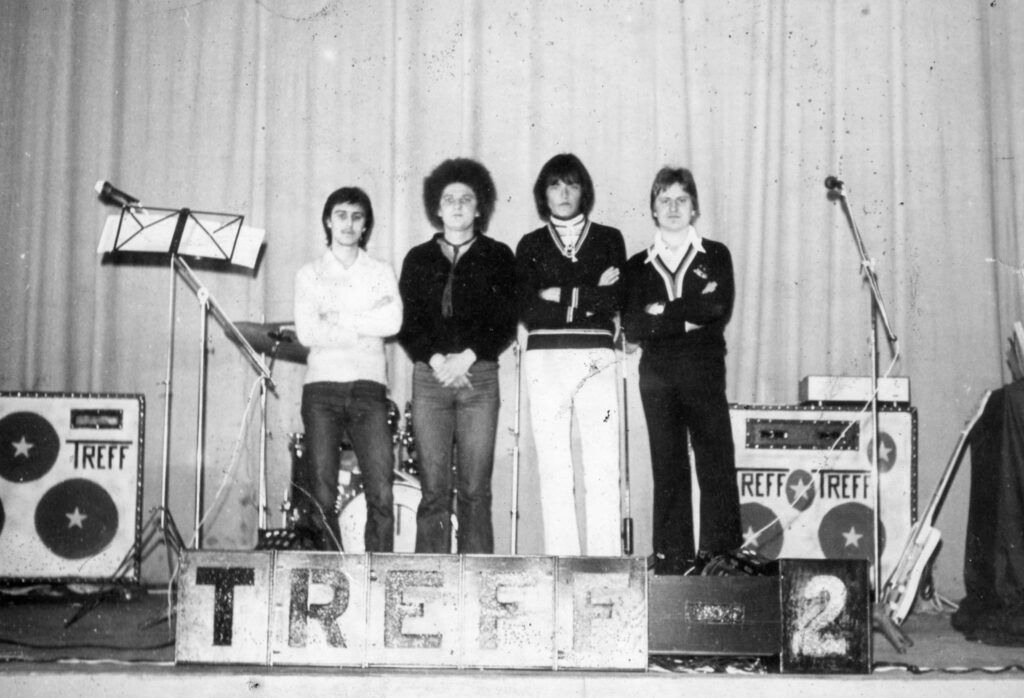 Ős-Treff 2 együttes zenészei, az ottani kultúrház színpadán, balról jobbra: Patócs László (dobok), Nagy Endre (basszusgitár), Takács Tibor (gitár), és az egyetlen vágai: Szabó József (billentyűs hangszerek).