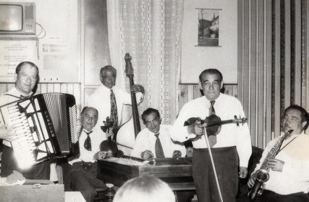 Balról jobbra: Bangó Vladimír (harmonikás), Rác Elemér (brácsás, Felsőkirályi), Blaho Béla (bőgős, Sopornya), Patkoló Béla (cimbalmos), Patkoló Ernő (hegedűs-prímás), Patkoló Árpád (szakszofonos).