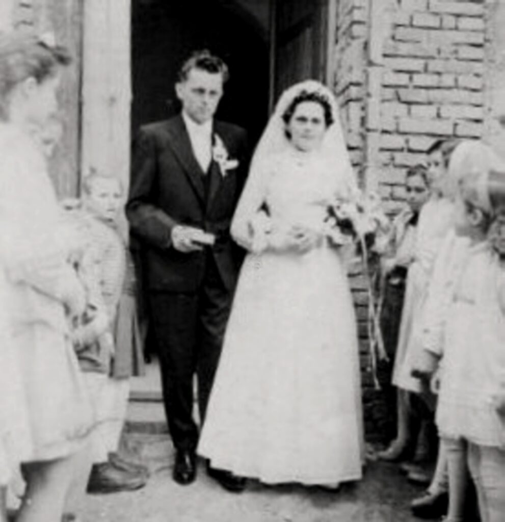 Kép Bréda József és Barcsek Magdolna polgári esküvője után készült 1962-ben, a régi HNB épülete előtt.