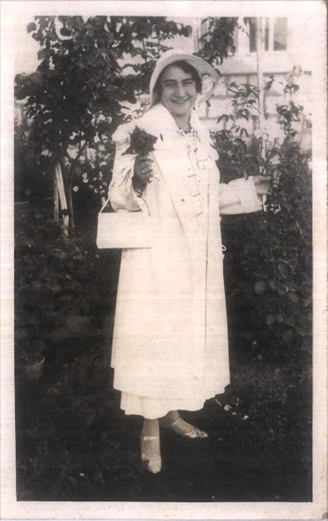 A fotón Bodon Lajos kántortanító nevelt lánya, Pósa Gézáné született Bodon Ilona fehér ruhában látható, amely Nemesradnóton az új iskola épülete előtti kertben készült 1935 körül.