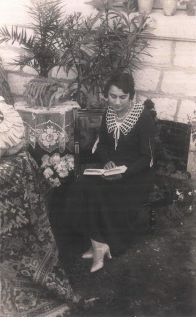 A fotón Bodon Lajos kántortanító nevelt lánya, Pósa Gézáné született Bodon Ilona olvasás közben látható, amely Nemesradnóton az új iskola épülete előtti kertben készült.