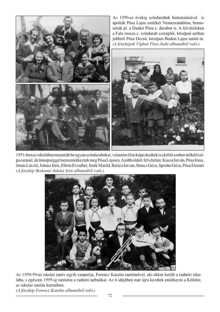 Az 1950-es évekig színdarabokkal is ápolták Pósa Lajos emlékét Randóton, bemutatták pl. a Dankó Pista c. darabot is. Felvételeken a Falu rossza c. színdarab szereplői, középső sorban jobbról Pósa Dezső, középen Bodon Lajos tanító úr.