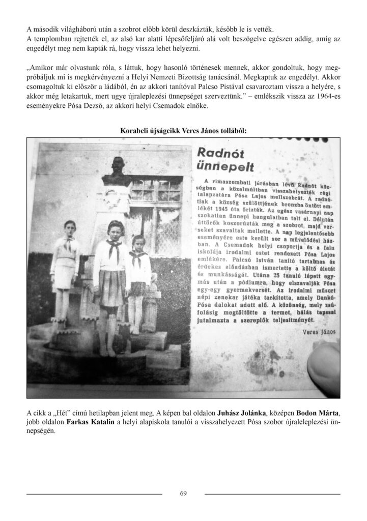 „Amikor már olvastunk róla, s láttuk, hogy hasonló történesek mennek, akkor gondoltuk, hogy megpróbáljuk mi is megkérvényezni a Helyi Nemzeti Bizottság tanácsánál. Megkaptuk az engedélyt. Akkor csomagoltuk ki először a ládából, én az akkori tanítóval Palcso Pistával csavaroztam vissza a helyére, s akkor még letakartuk, mert ugye újraleplezési ünnepséget szerveztünk” – emlékszik vissza az 1964-es eseményekre Pósa Dezső, az akkori helyi Csemadok elnöke.