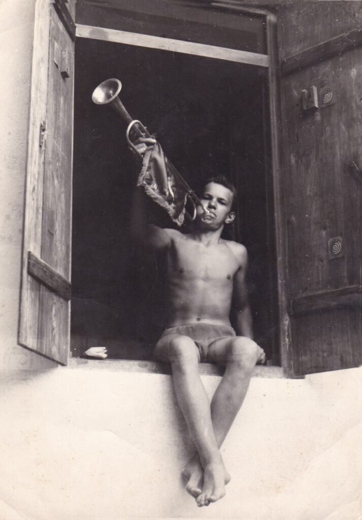 Csehországi nyári táborban reggelente trombitával ébresztették az ott lakókat. A képen Bödők Dénes (szül 1944).