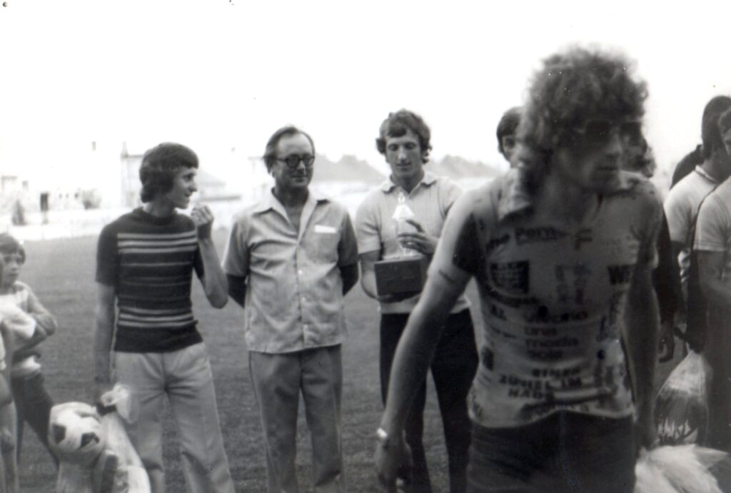 A sportpályán készült fotón: Horváth Jenő (balról), Kozmér Győző (clubelnök), Forró Róbert (csapatkapitány), s legelöl a rivális taksonyi focicsapat gólgyárosa, Mészáros Imre.